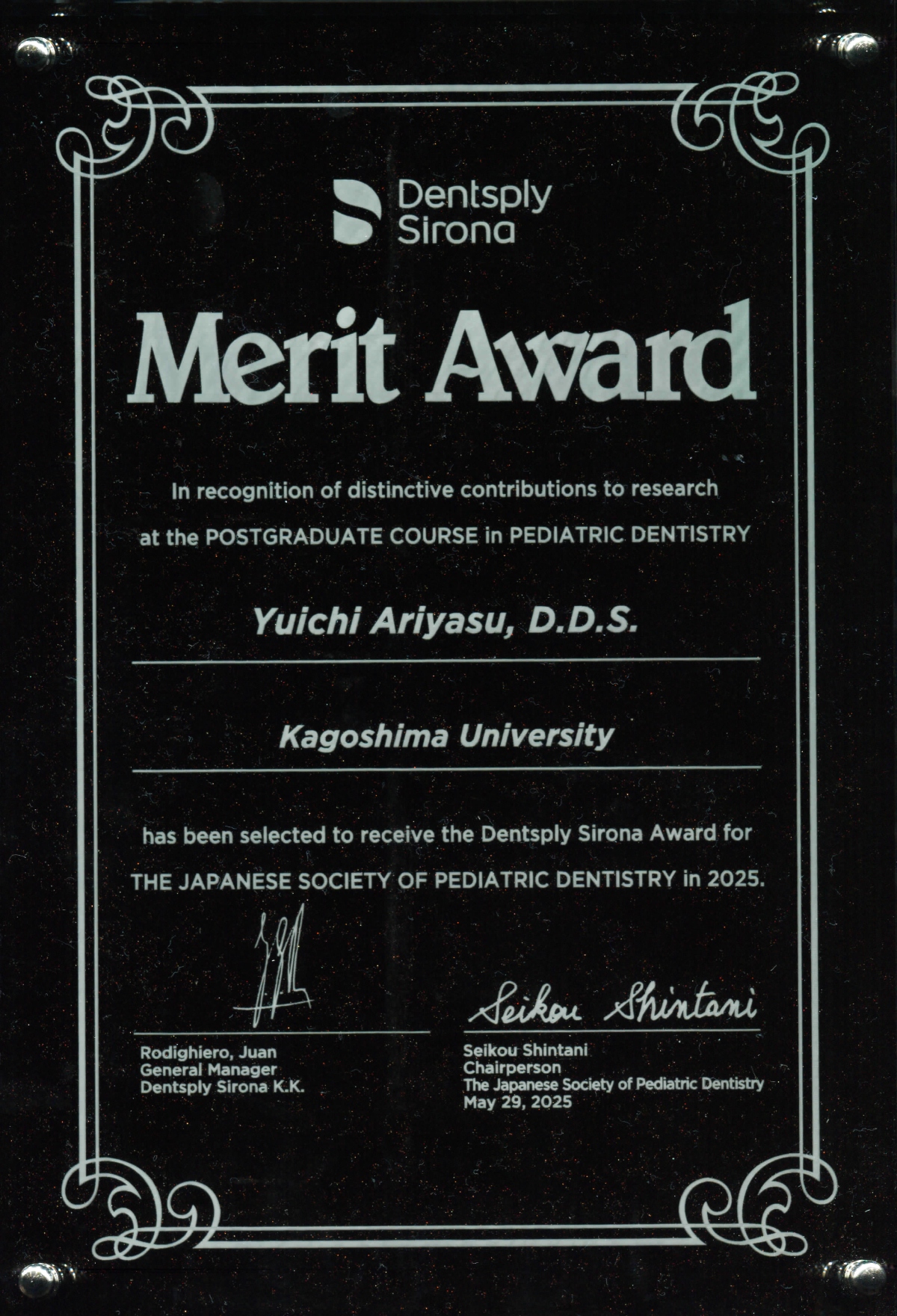 鹿児島大学病院発達系歯科センター小児歯科の有安雄一助教が執筆した論文「Three-dimensionalanalysis of lip and chin movements during mastication with artificial nasal obstruction」が、国際学術誌『Archives of Oral Biology』に掲載され、日本小児歯科学会よりデンツプライ賞を受賞しました。
