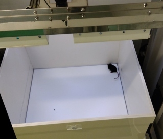 仕様 試験箱の色・床のテクスチャーと報酬(または嫌悪)刺激との連合を予め学習させる(3日間程度)。試験当日は黒箱-白箱間を自由に移動させ、どちらの箱を好むか(滞在時間・入室回数)を赤外線motion sensorの出力をPCに取り込むことにより判定